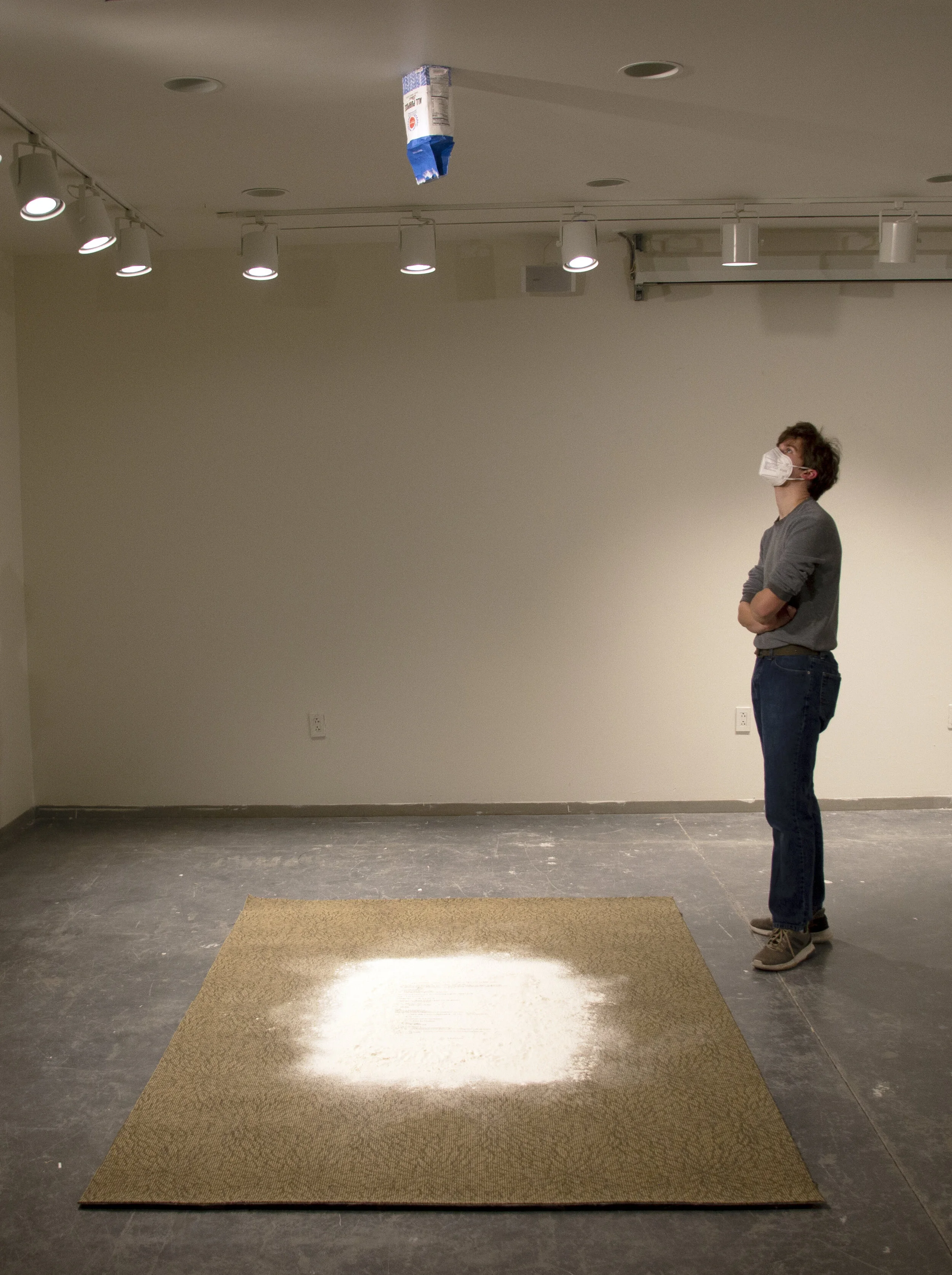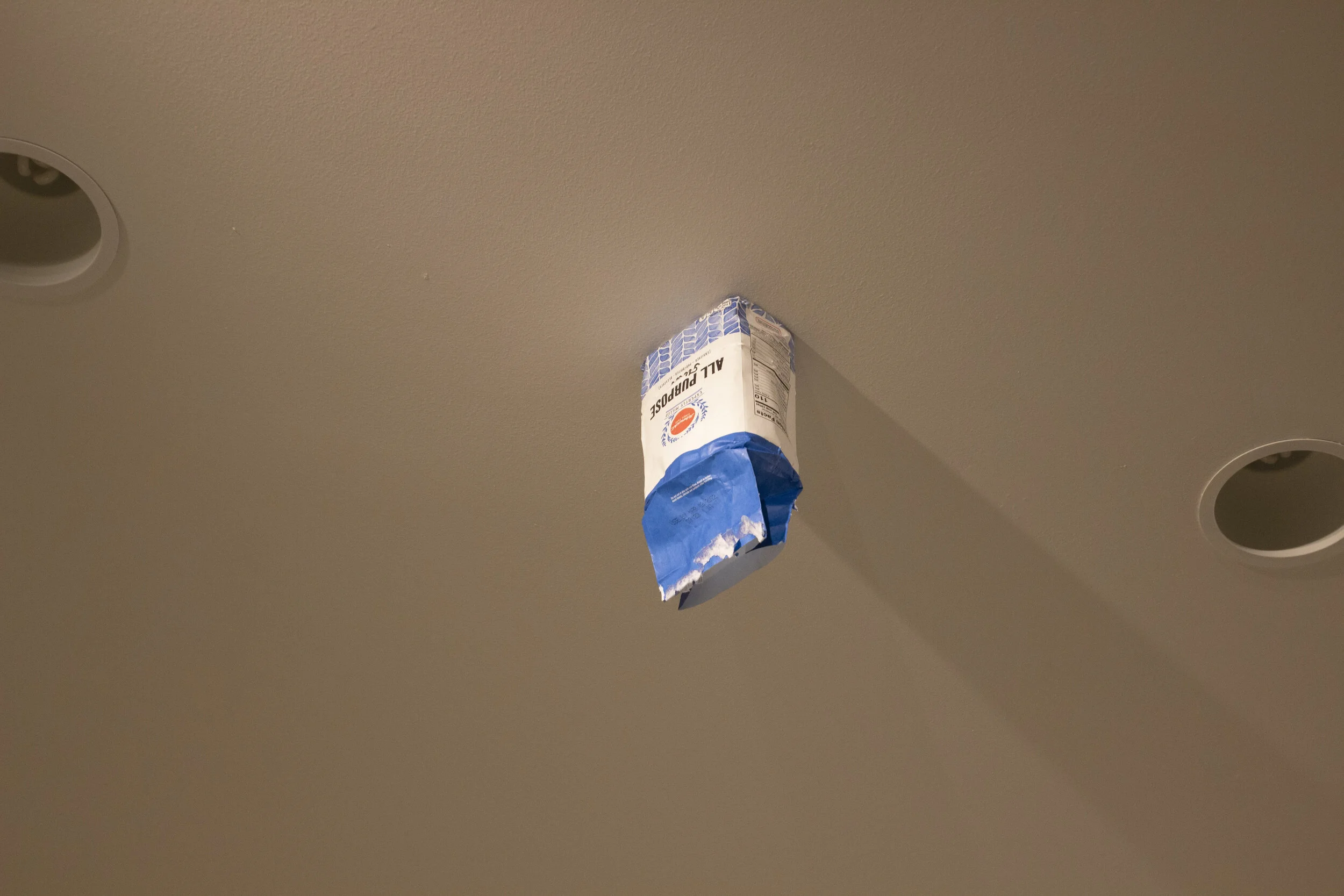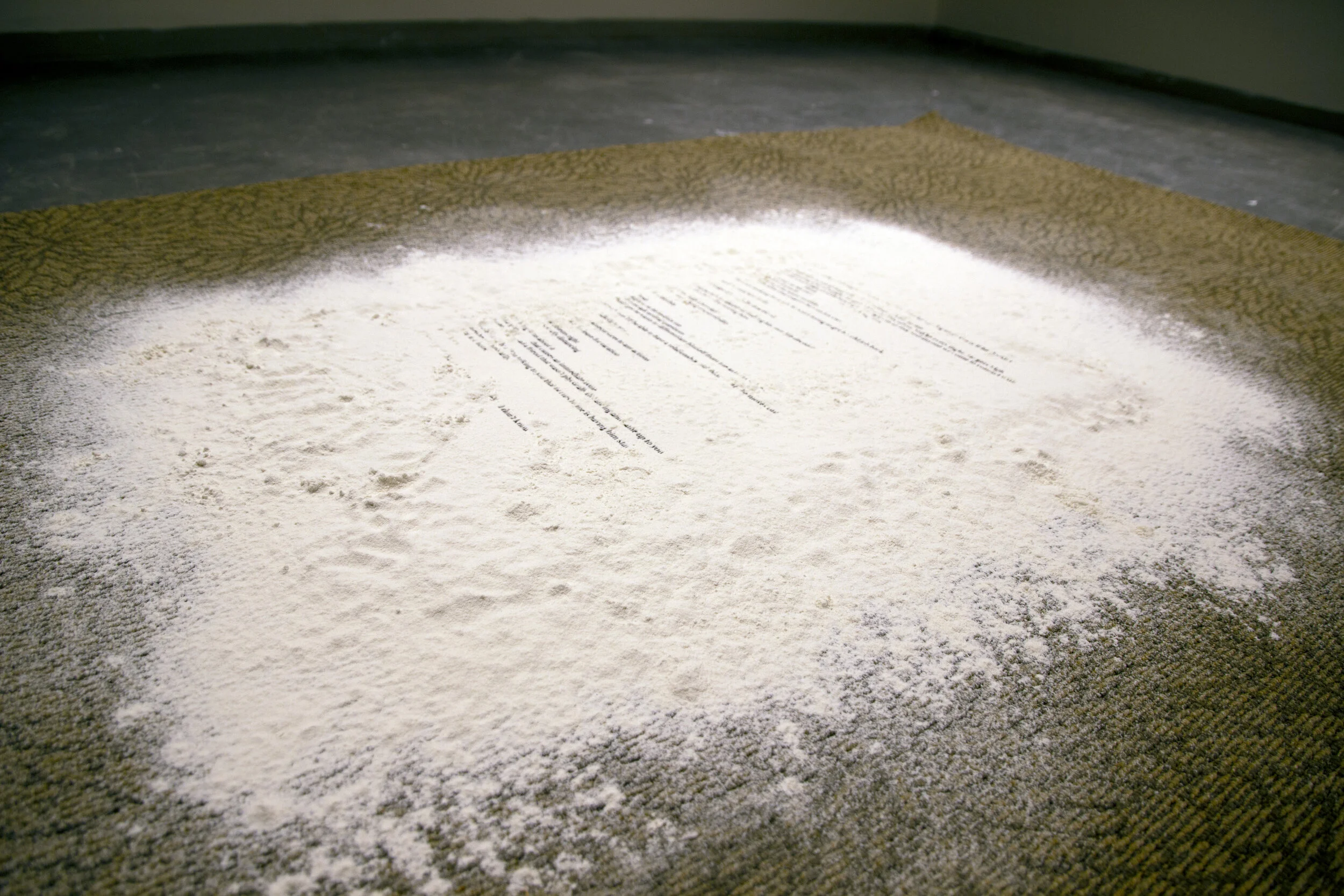 Audio installed inside a flour bag, attached upside-down to the ceiling. Text—which does not match the audio—rests on a carpet, partially obscured by flour.