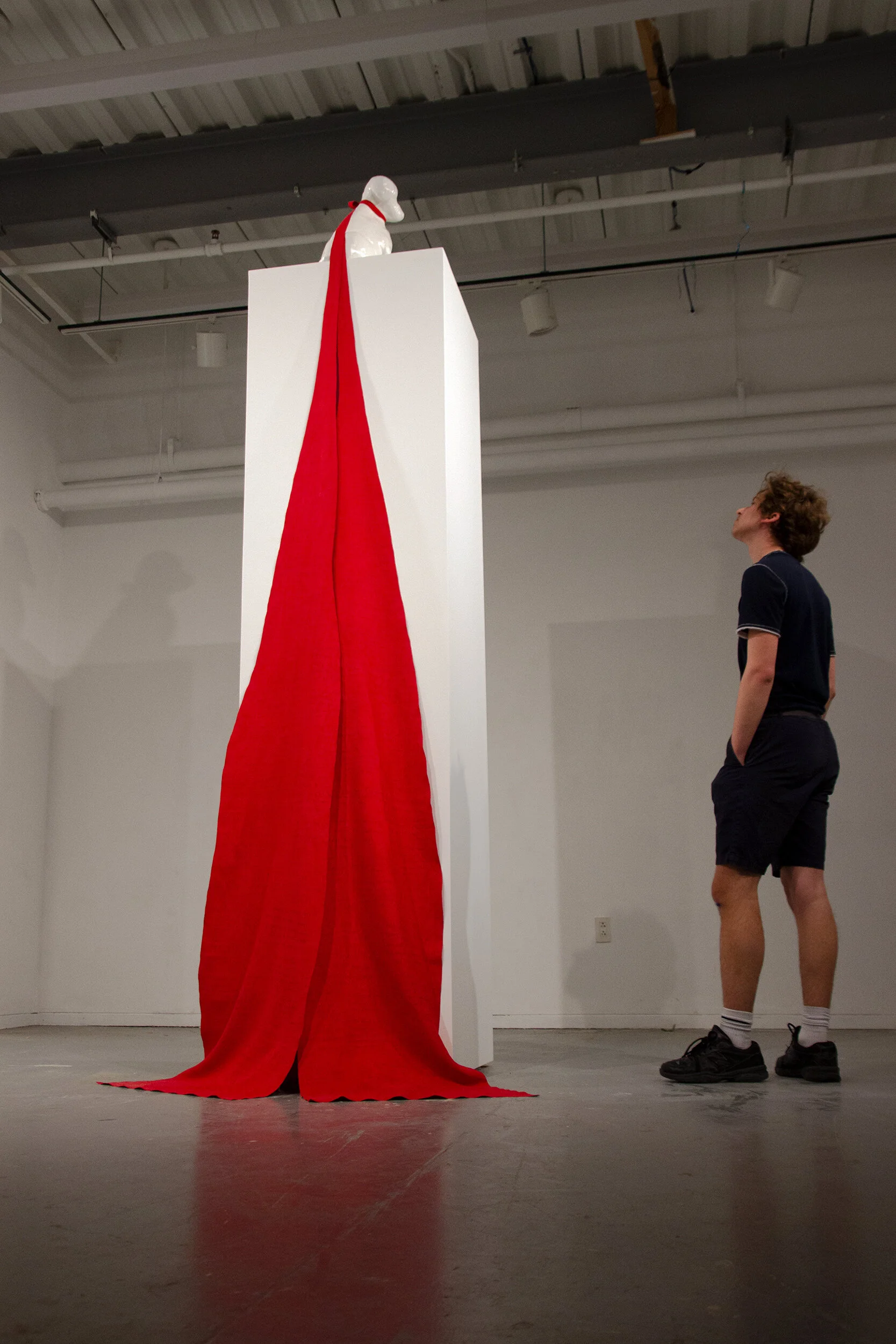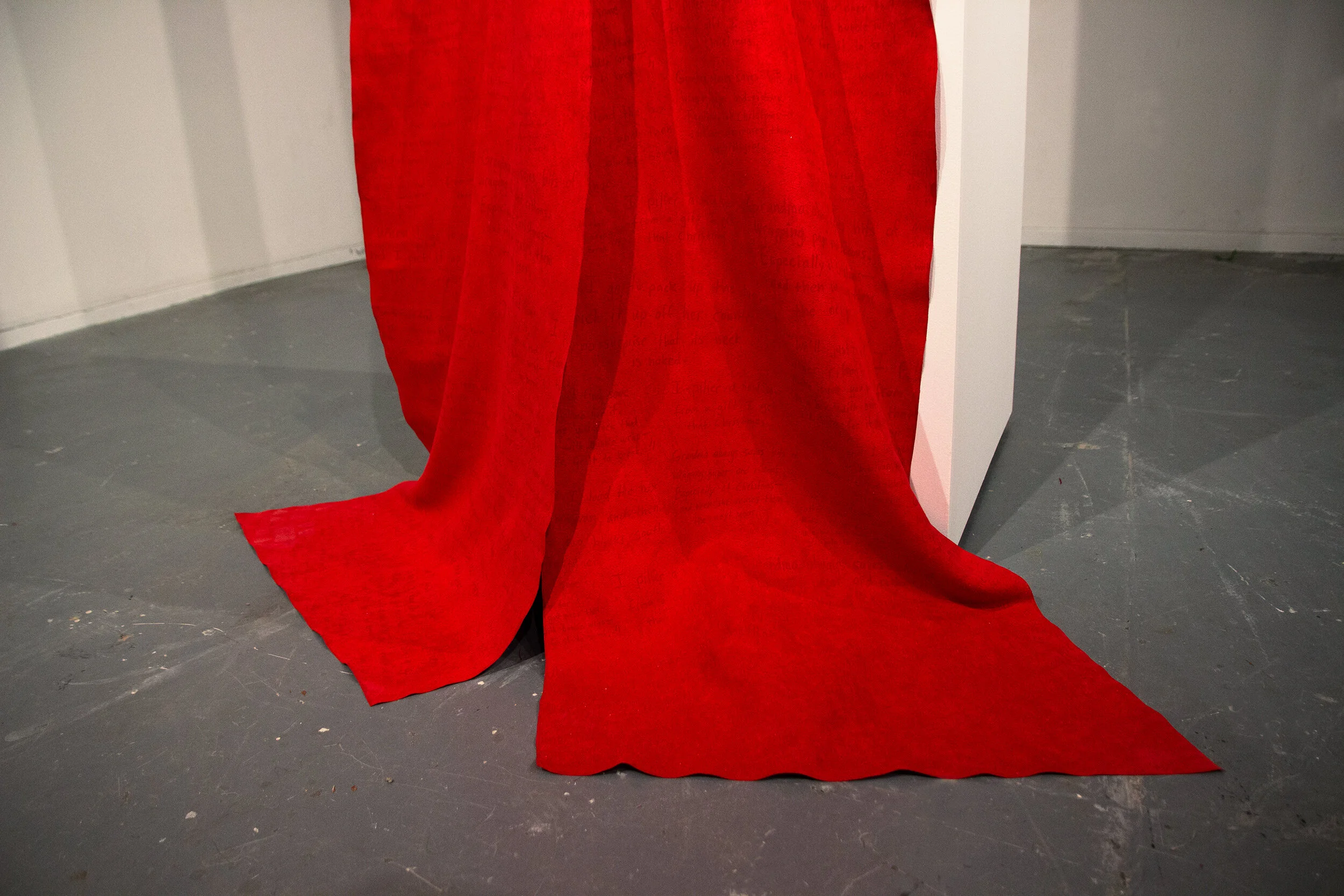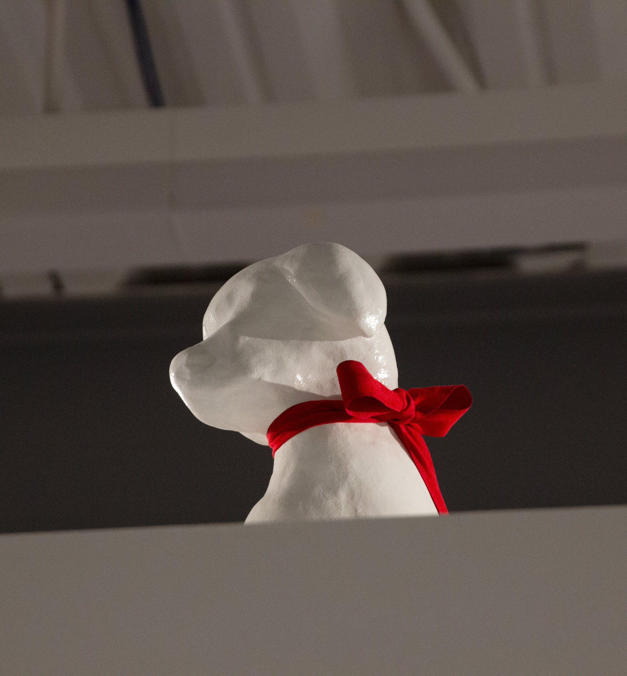 Ceramic dog recreated from memory, screen-printed cloth with text, MDF, sound (2:15) emanating from the top of the pedestal.