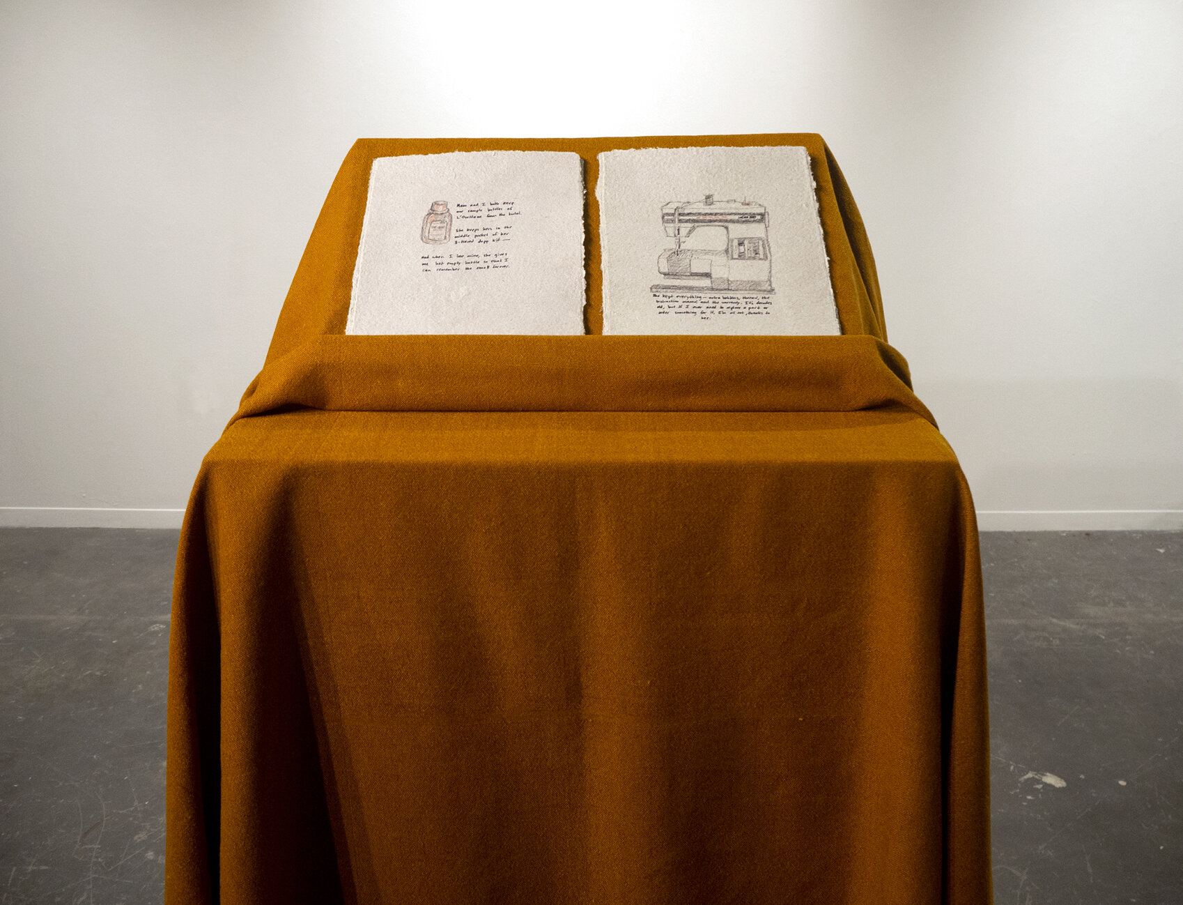 Drawings of cherished gifts and hand-written text about the memories associated with them. Drawn on hand-made paper with pulp sourced from bibles.