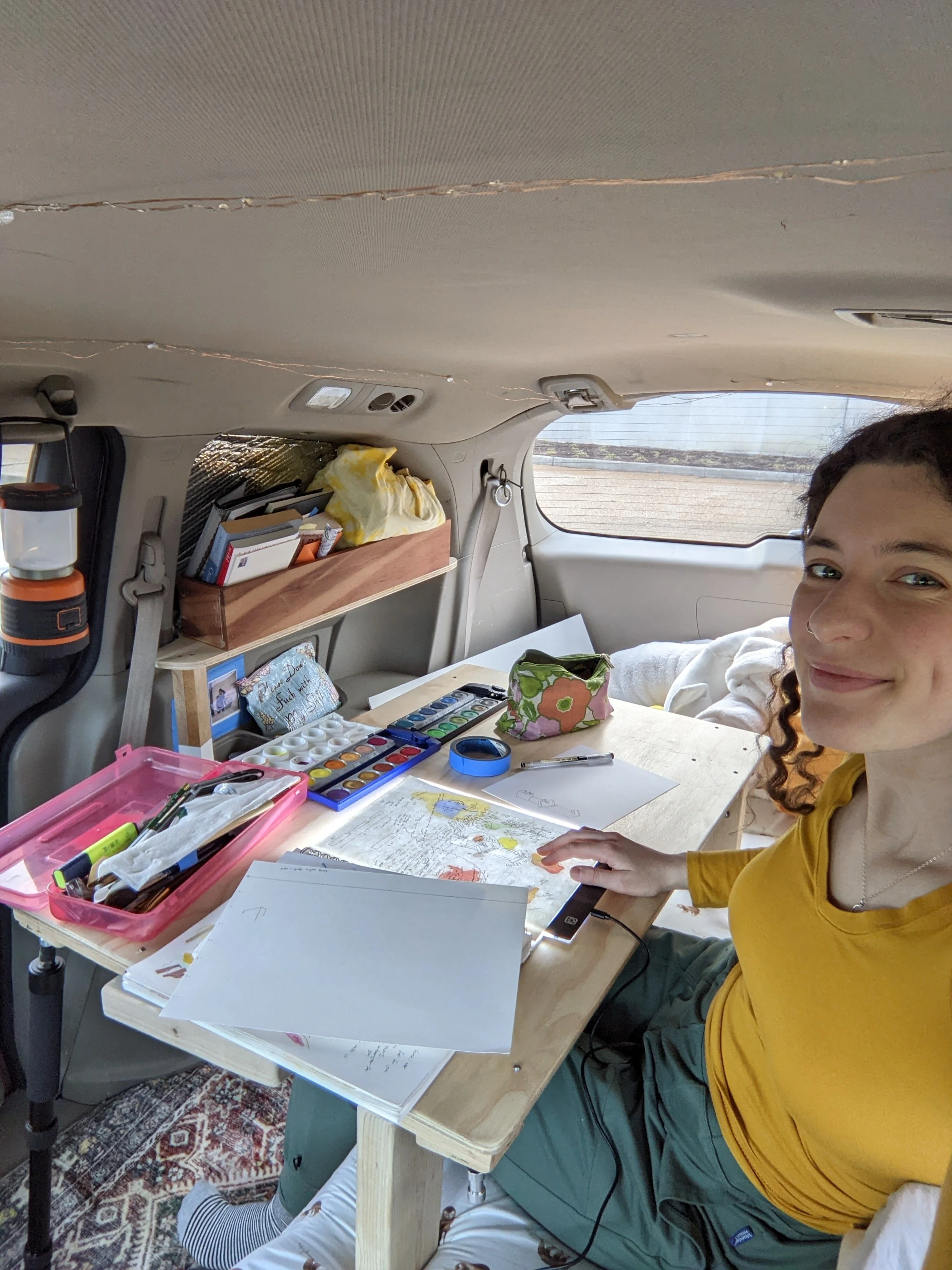 In early fall of 2022 I had finished only the basic pieces of my build—like my bed and sink. I set out across the country to get a sense of what the travel was like, and fine tune my wishlist for the rest of the build. I finished this first drive in D.C., where I stayed with family until Christmas and made a mini gallery install in my bathroom.